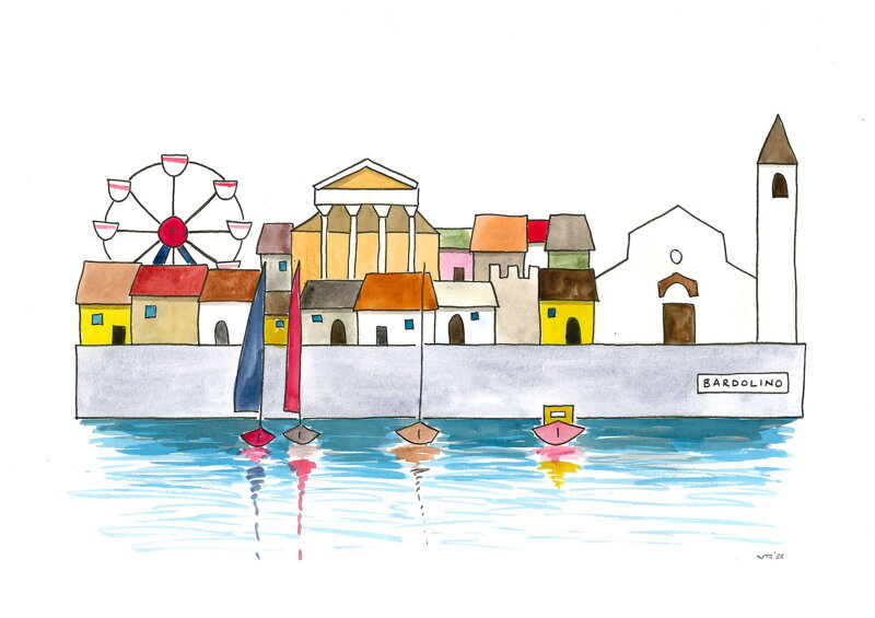A hand-painted illustration depicting the villages of Lake Garda with a simple, playful and childlike style, reinterpreting the characteristic buildings with lightness and creativity.