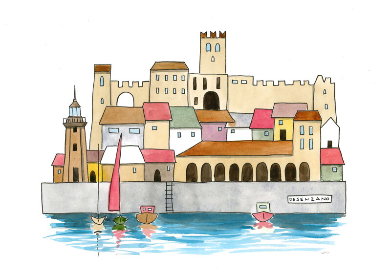A hand-painted illustration depicting the villages of Lake Garda with a simple, playful and childlike style, reinterpreting the characteristic buildings with lightness and creativity.