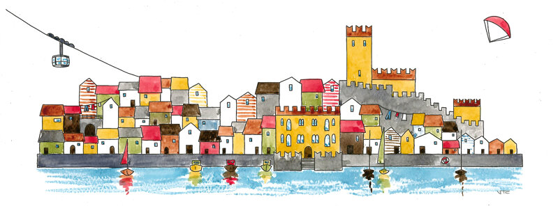 A hand-painted illustration depicting the villages of Lake Garda with a simple, playful and childlike style, reinterpreting the characteristic buildings with lightness and creativity.