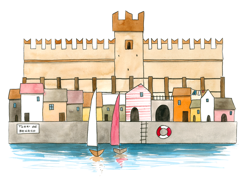 A hand-painted illustration depicting the villages of Lake Garda with a simple, playful and childlike style, reinterpreting the characteristic buildings with lightness and creativity.